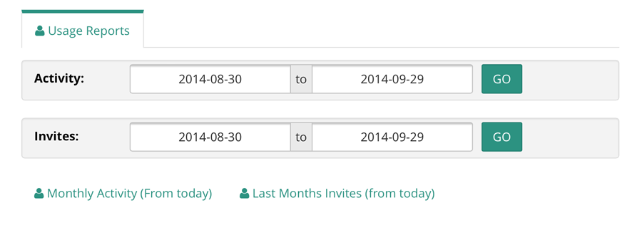 From the "Usage Report" tab, select the date range for the report using the date fields in the "Invites" section (or leave as the default of 1 month), and then click the green "Go" button.