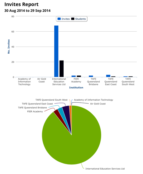 The "Invites" report displays a comparitive graph for active invites and used invites (registered students) for the set date range.