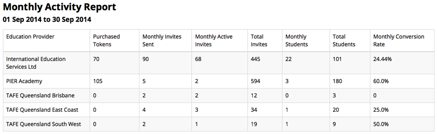 From the SWS App, click on the blue "Reports" button in the top right corner to get the education provider "Usage Report". Reports available from this tab are "Activity" and "Invites".